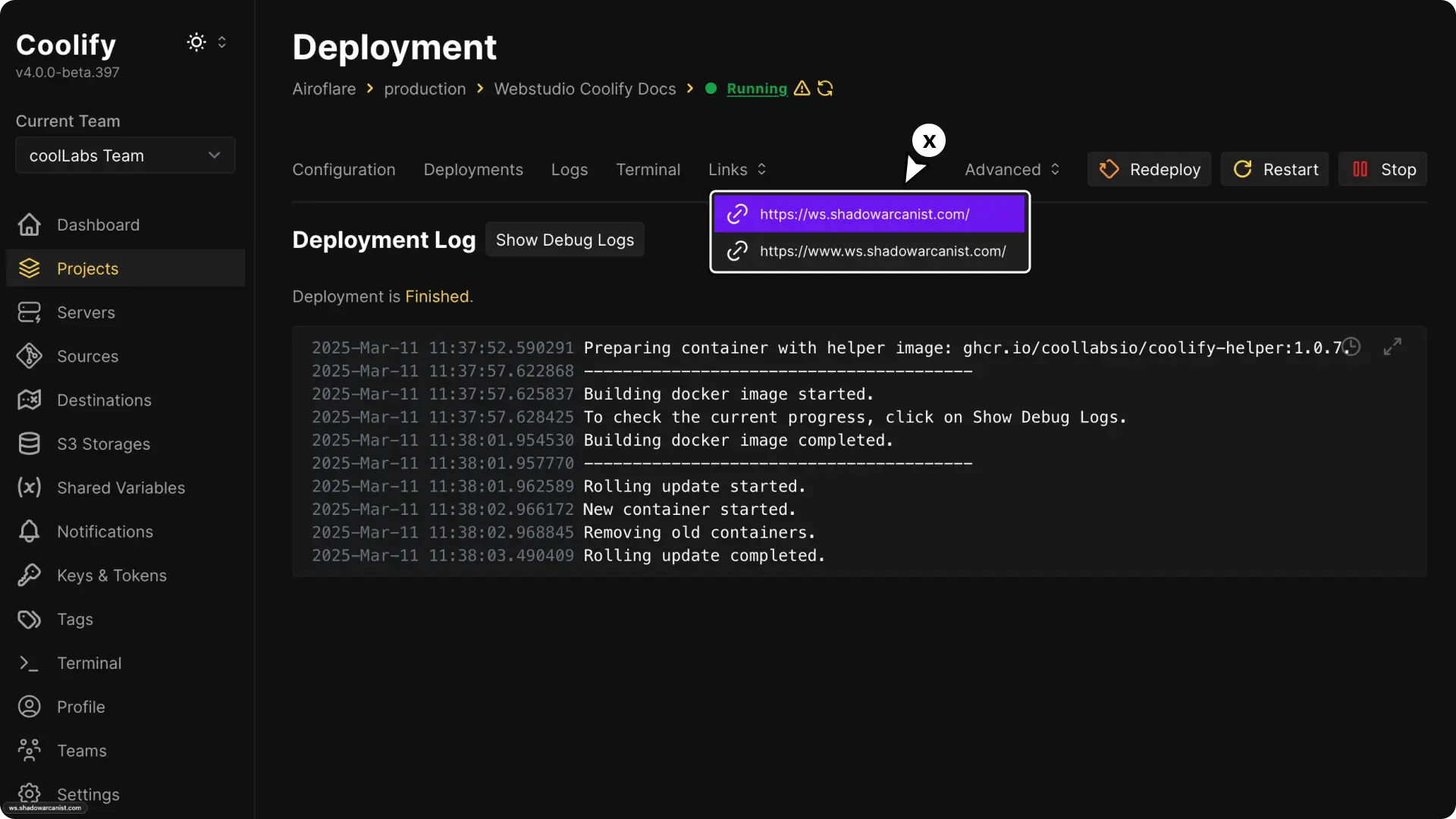 - Configure Domains & Deploy: Enter your domain in the domains field and Click Deploy and wait as Coolify builds and deploys your project.