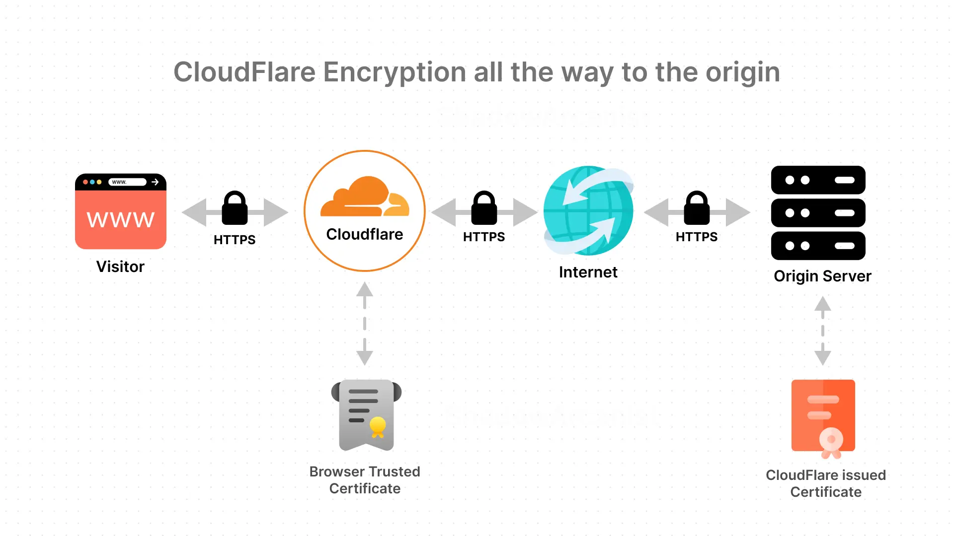 It encrypts the data exchanged between your server and Cloudflare, keeping it safe.