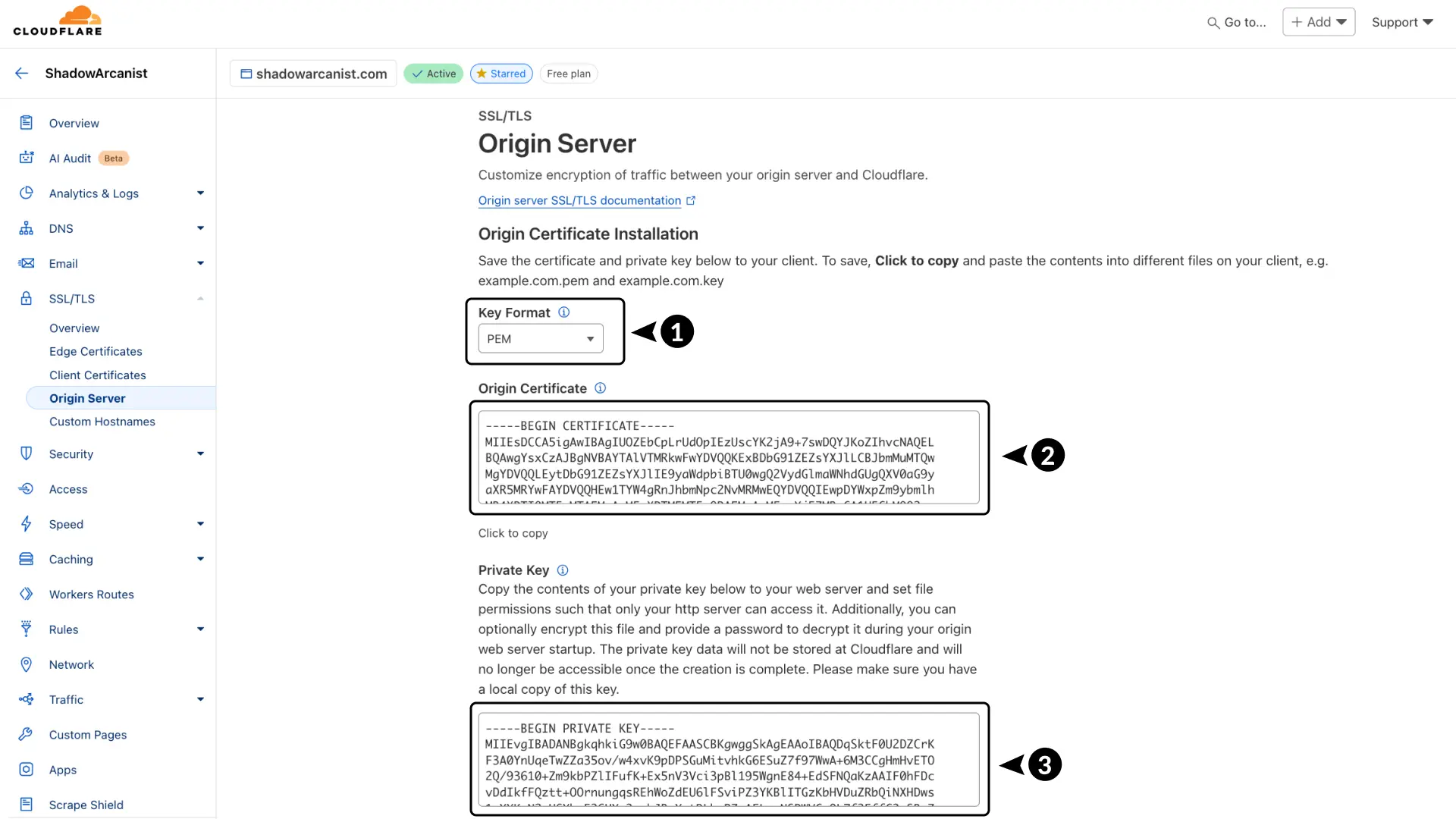 > shadowarcanist.cert shadowarcanist.key打开 shadowarcanist.cert 文件并粘贴来自 Cloudflare 仪表板的证书: