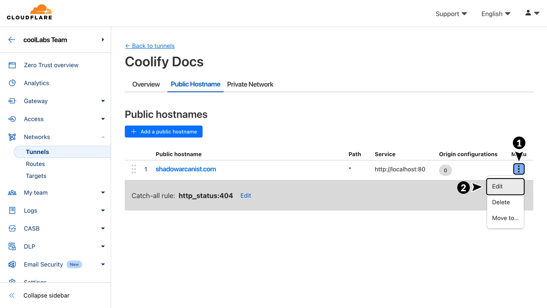 - 如果您的 Coolify 实例与您想要配置的域在同一隧道上,请确保在开始这些步骤之前,您可以使用服务器 IP 和端口(例如 203.0.113.1:8000)访问 Coolify 仪表板。